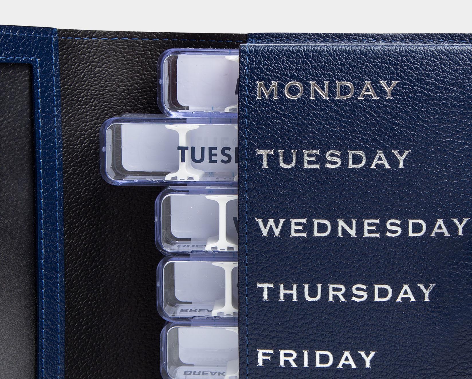 - 7 plastic labelled pill boxes, removable pouch for smaller quantity, secure press stud fastener strap