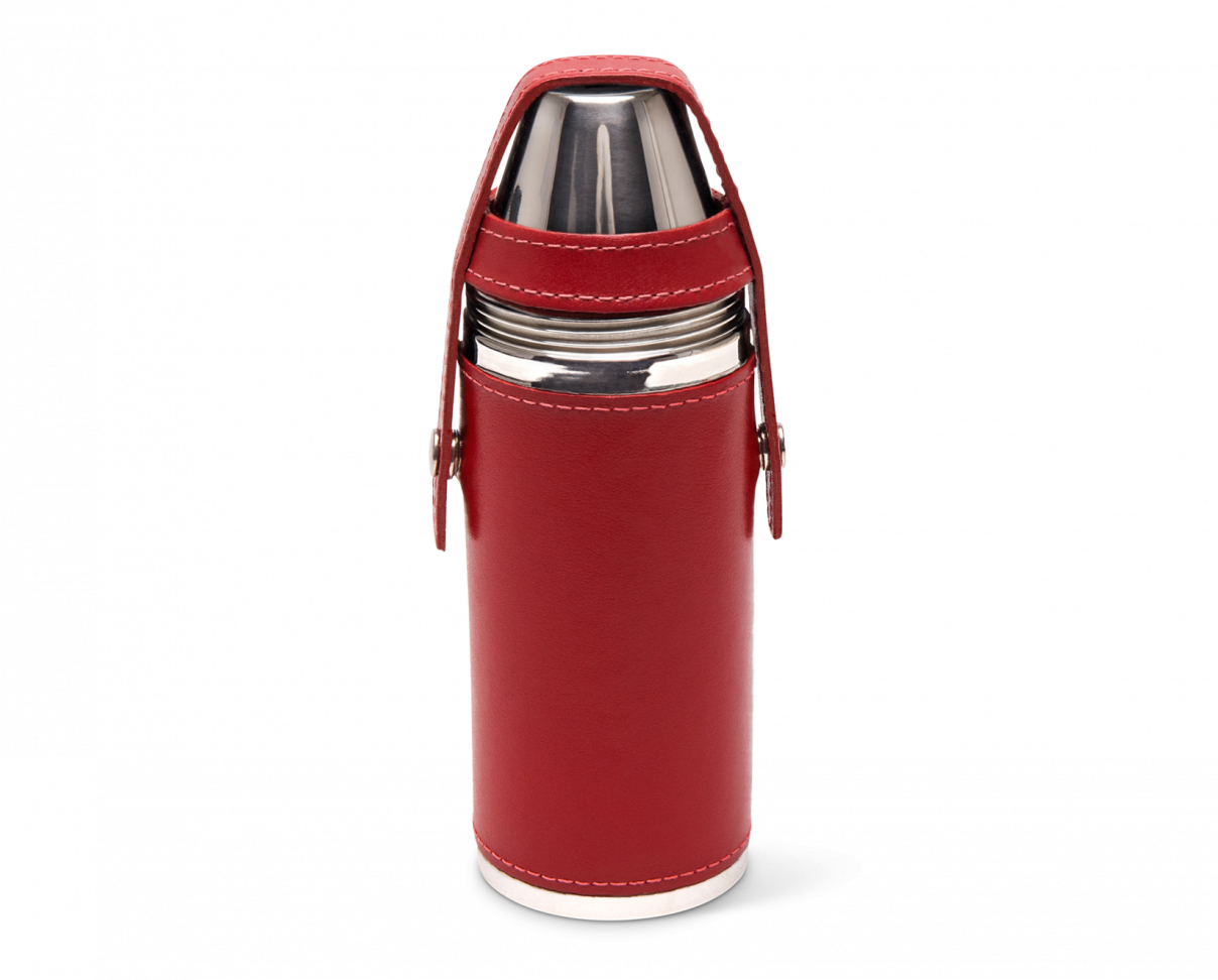 - Features list: 4 stainless steel cups, leather top to hold cups, stainless steel funnel